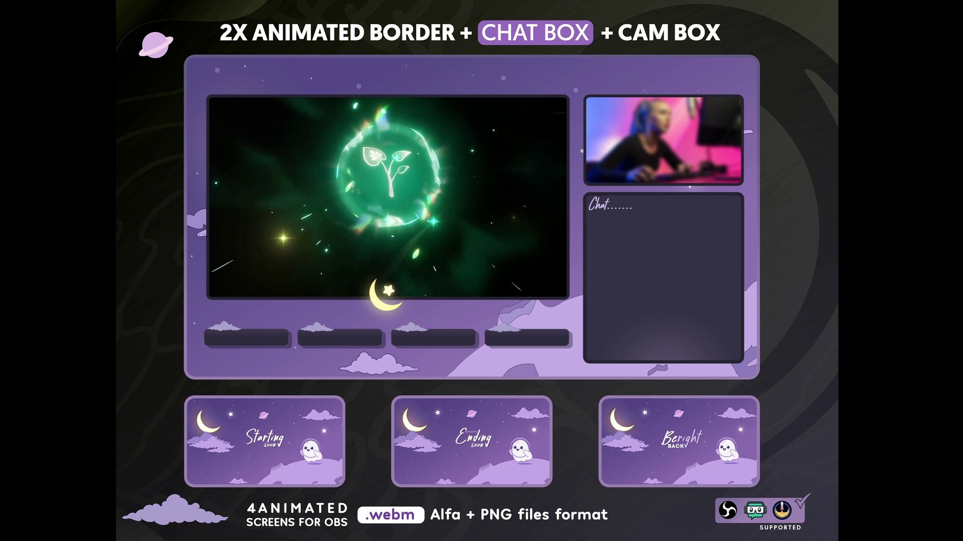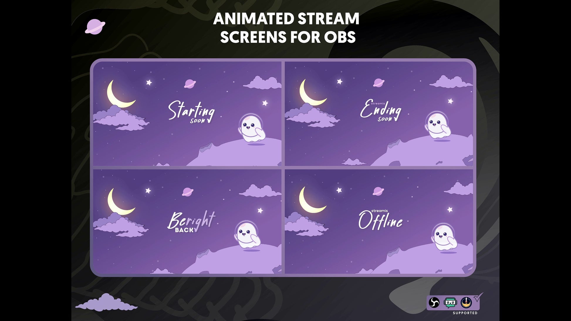 1) Cute 4 Animated Screens (Starting Soon, Be Right Back, Stream Ending, Module Intermission and one screen game border, Offline Screens)
