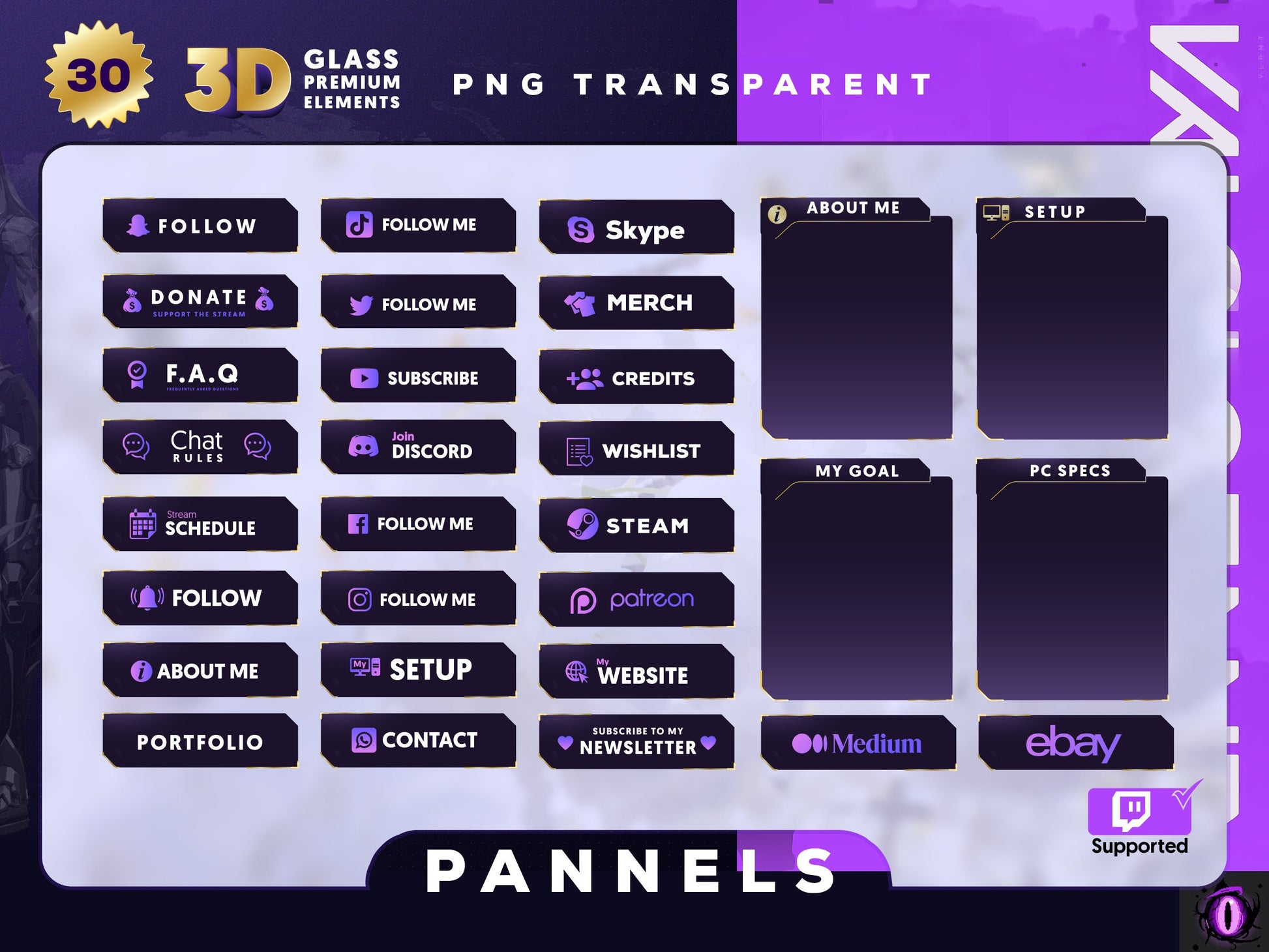 ♡ This Valorant Reina Skin Purple Panels Package includes 30 unique panels for your Twitch or other streams! Featuring the Reina character from Valorant game and eye catchy colors. ♡